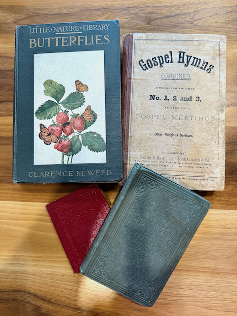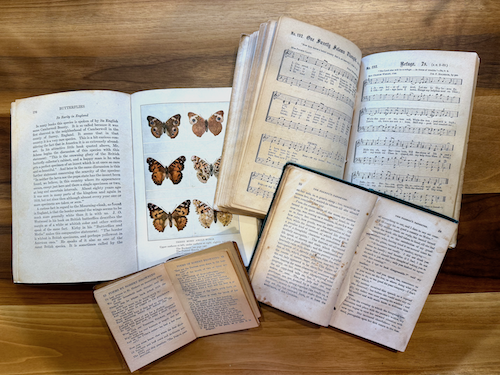 Old book pages – I frequent thrift shops and used book stores for these. It’s great to have one that is just text and then perhaps an old butterfly or bird field guide and old sheet music. Also keep a look out for old ledgers etc. Both of the ladies above have a first layer of old book pages ripped and collaged on the paper. Zoom in and check it out! Here are some of the old books I keep at my art table:
